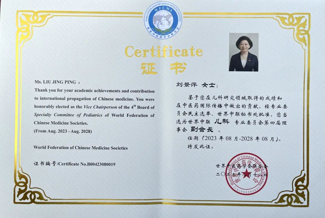 3522vip浦京集团药业集团党委书记、董事长刘景萍当选世界中医药学会联合会儿科专业委员会第四届理事会副会长